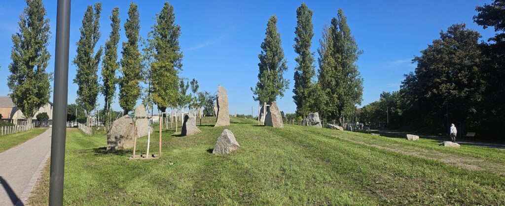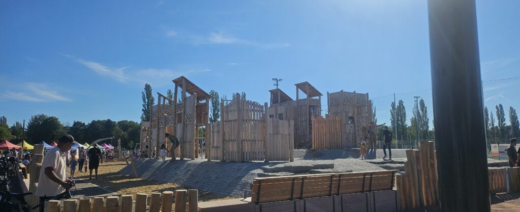 Nous sommes arrivés vers 10h pour découvrir le tout nouveau parc de Strasbourg. En effet, ce samedi 20 septembre avait lieu l’inauguration du Parc des Romains. 5,5 hectares de verdure à l’entrée de Koenigshoffen, avec une énorme structure en bois représentant un oppidum pour les enfants. Ah la la, qu’est-ce que j’aurais aimé avoir 6 ans à ce moment! Outre les jeux, beaucoup de verdure, hâte d’y retourner quand les arbres auront poussé et qu’il y aura des fleurs.